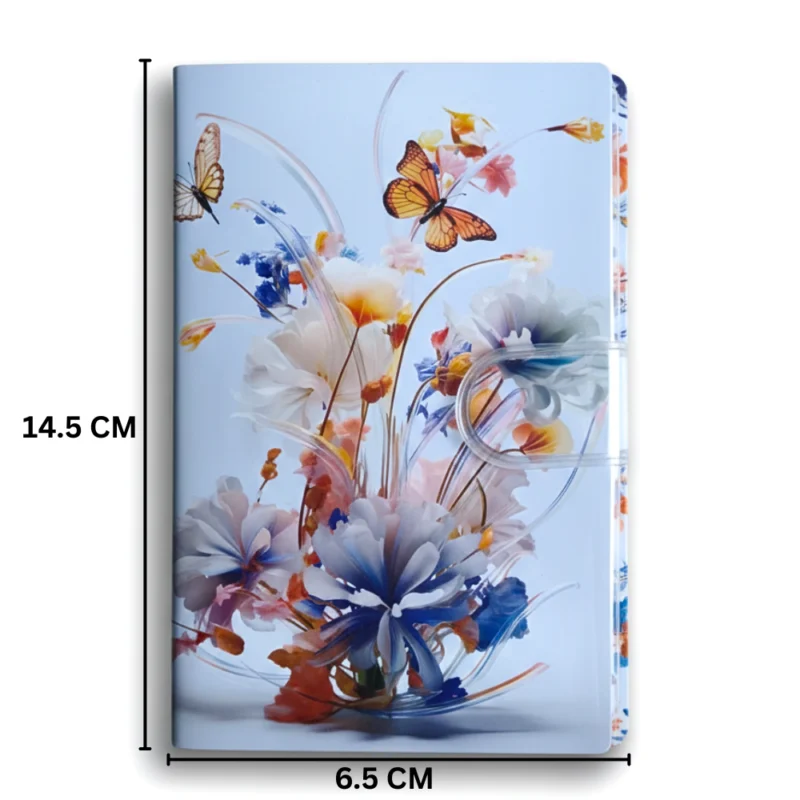 نوتة جيب صغيرة برسمة ورود وفراشات ملونة – 14.5×6.5 سم مناسبة للدراسة والهدايا