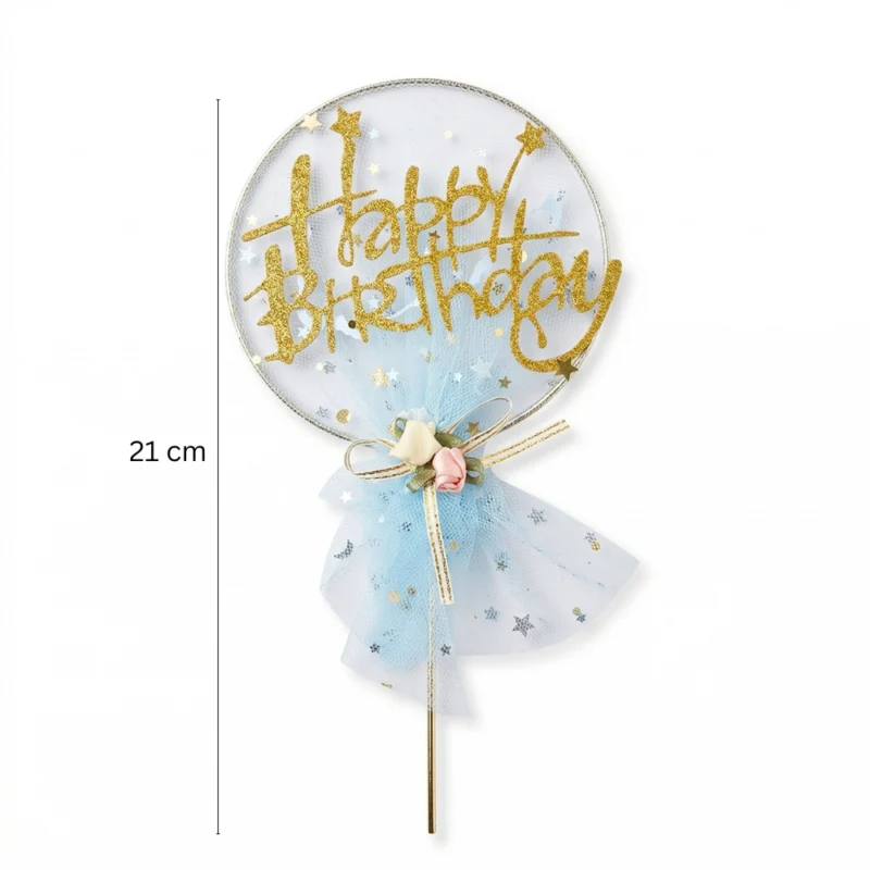 توبر كيك Happy Birthday ذهبي بطول 21 سم مع تول أزرق – زينة عيد ميلاد فخمة للكيك
