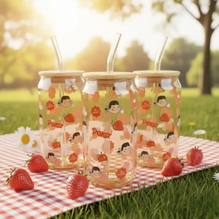 مج كانز زجاجي 550 مل بغطاء خشب وشاليمو – تصميم ستروبري مميز للمشروبات العصائر والموهيتو