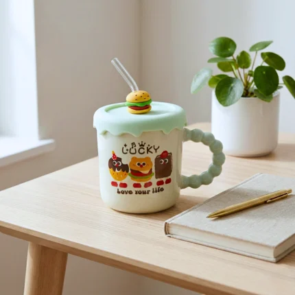 مج سيراميك بتصميم كرتوني لطيف بغطاء أخضر ومصاص زجاج – كوب قهوة عصري Love Your Life بمقبض مميز