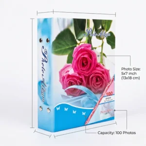 تم تصميم ألبوم صور ليستوعب الصور بمقاس 5×7 بوصة (13×18 سم) وهو أحد أكثر المقاسات شيوعًا في عالم الطباعة الفوتوغرافية. هذا المقاس يسمح بعرض الصور بشكل واضح وجميل مع الحفاظ على التفاصيل الدقيقة للصورة.