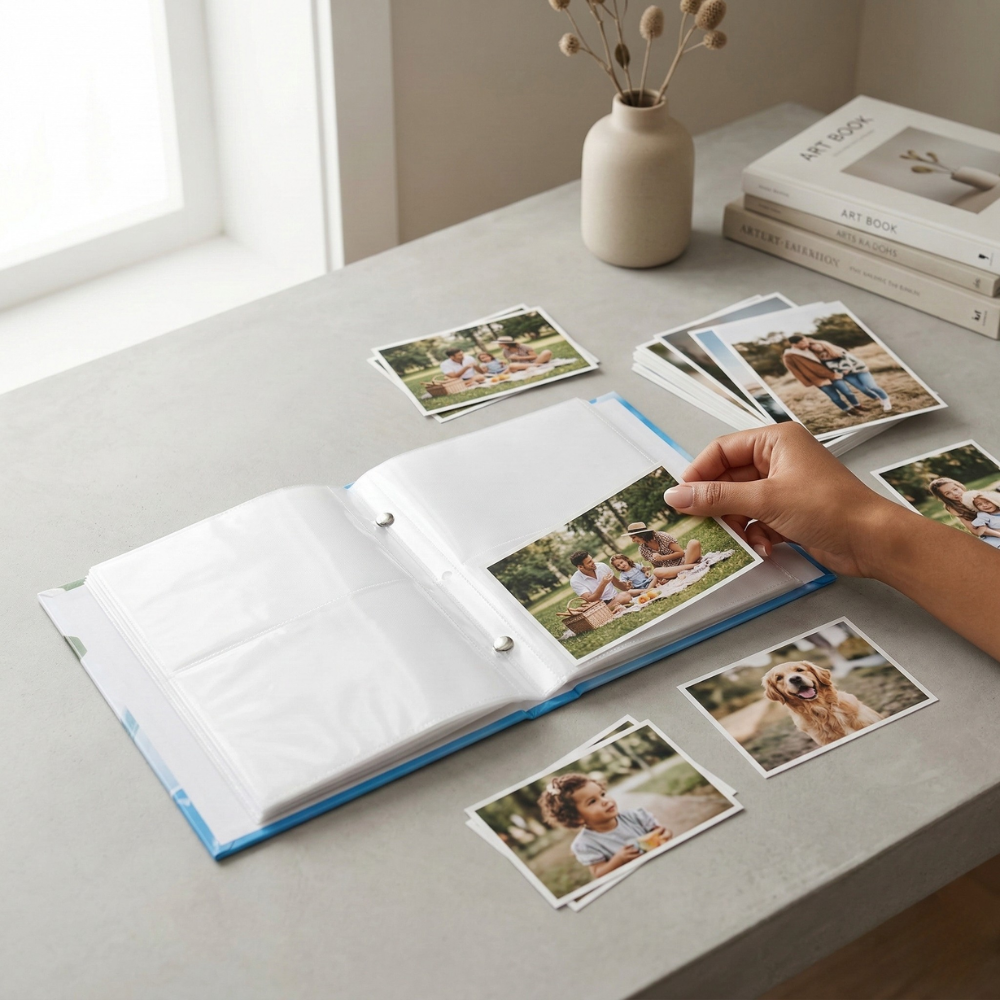 بدلاً من ترك الصور داخل الأدراج أو الصناديق، يمكن وضعها داخل ألبوم صور حيث يتم ترتيبها بطريقة جميلة تحافظ عليها من الضياع أو التلف. كما أن الجيوب الشفافة داخل الألبوم تسهل إدخال الصور وإخراجها عند الحاجة.