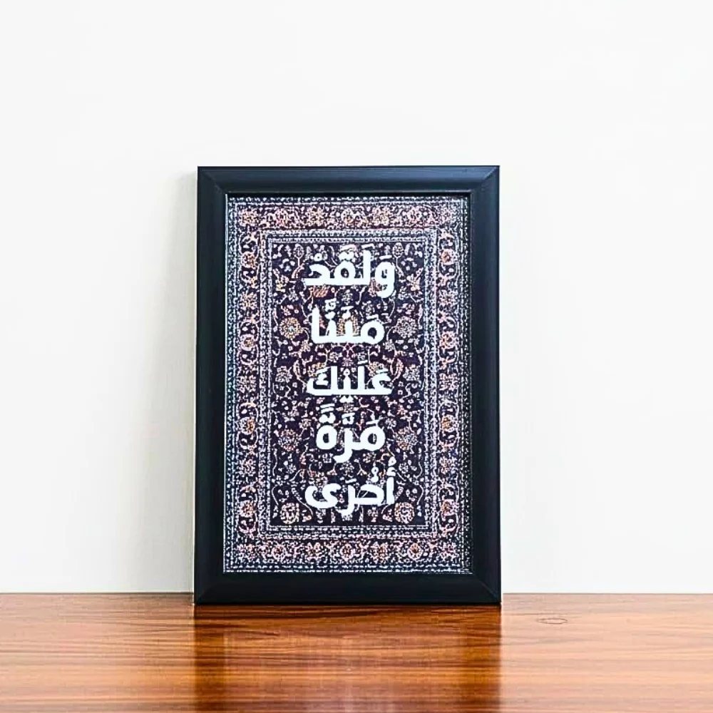 برواز إسلامي بتصميم جملة قرآنية «ولقد مننا عليك مرة أخرى» بإطار أسود أنيق ومقاس 20×30 سم، قطعة ديكور روحانية راقية تضيف لمسة إيمانية وجمالية للحوائط في المنازل والمكاتب.