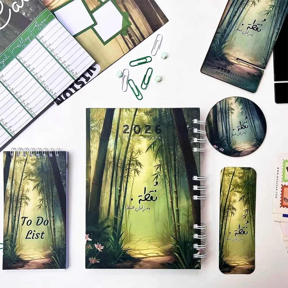 السطح الخارجي للأجندة، والتفاصيل البسيطة في To-Do List، والكوستر الخشب، وحامل الموبايل… كل ده معمول بانسجام شديد يخدم الهدف الأساسي: سنة هادية ومنظمة، وأهداف واضحة، ويوم متظبط بدون فوضى.