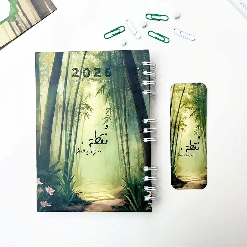 الأجندة كلها معمولة بخامات ممتازة، خطوط واضحة، تقسيمات مرتّبة، وتصميم بامبو يديك طاقة هادئة كل ما تفتحي الصفحة.