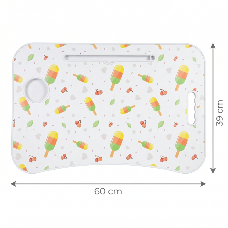 التصميم العملي اللي بمقاس 60 × 39 سم قريب جدًا من المقاسات الشائعة في السوق لهذا النوع من الترابيزات، وغالبًا بيكون مزود بحامل كوب وفتحة للموبايل أو التابلت، وهي من المزايا المطلوبة جدًا في ترابيزات اللابتوب الحديثة.