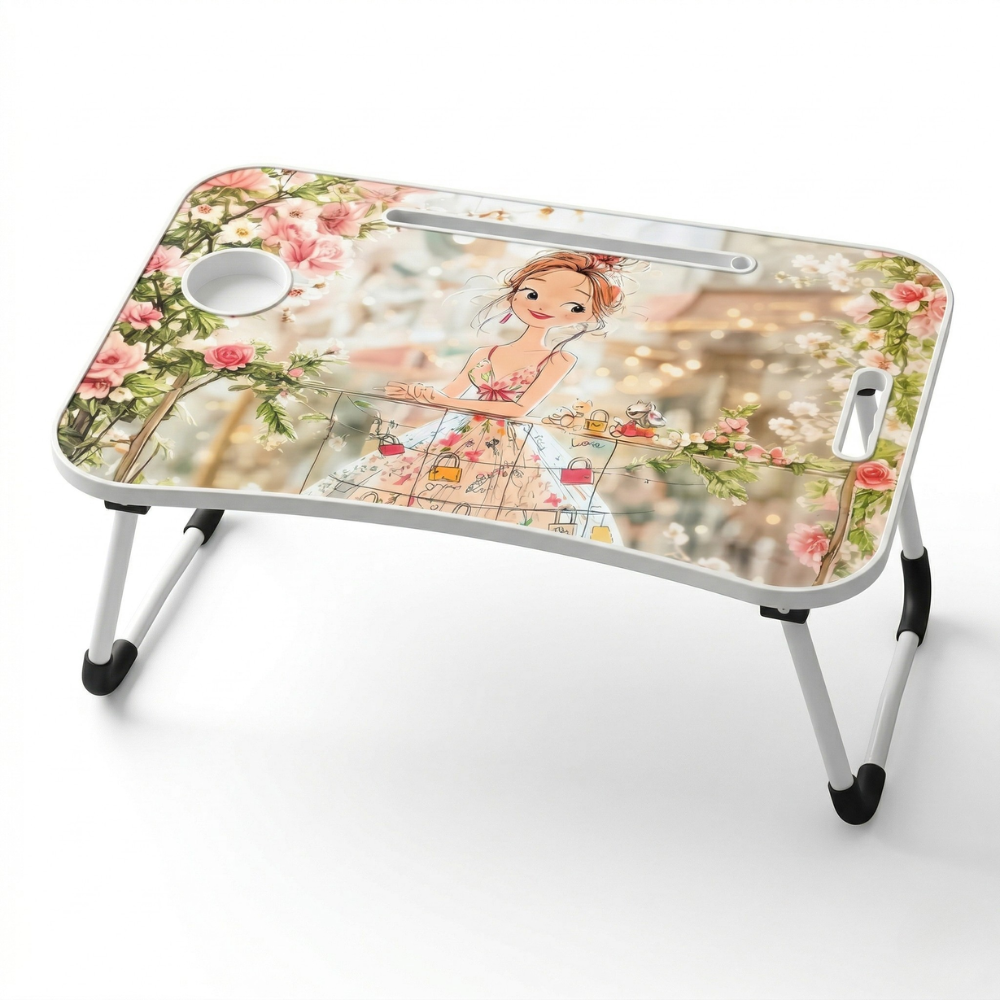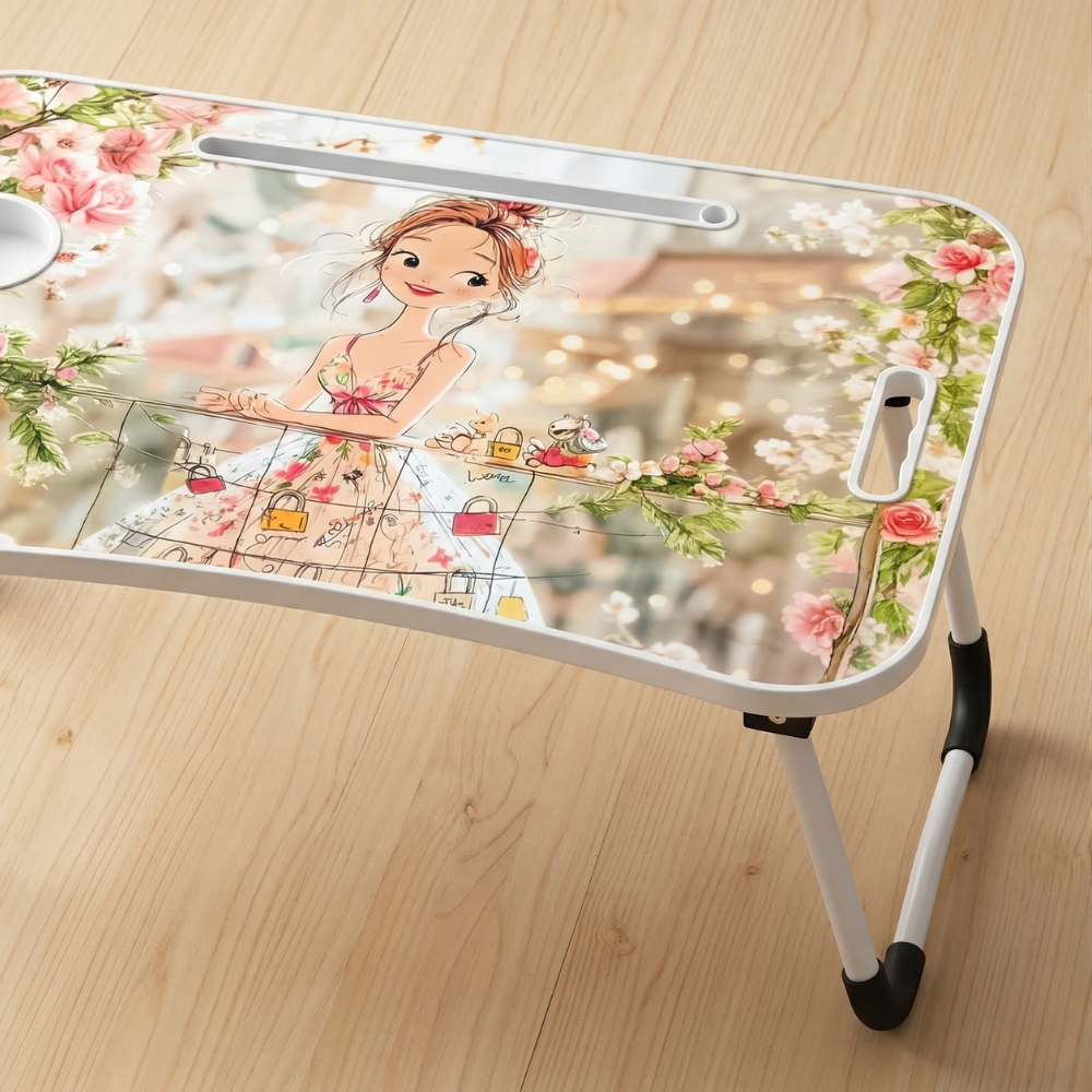 تتميز هذه ترابيزة لابتوب بتصميم عصري أنيق يناسب جميع الأذواق، مع رسمة بناتية رقيقة مزينة بالورود والألوان الهادئة التي تضيف لمسة جمالية مميزة لأي غرفة.