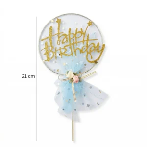 يتميز توبر كيك Happy Birthday بتصميم ذهبي لامع مكتوب بطريقة أنيقة وعصرية، مع إضافة تول أزرق ناعم يمنح المنتج لمسة رقيقة ومميزة.