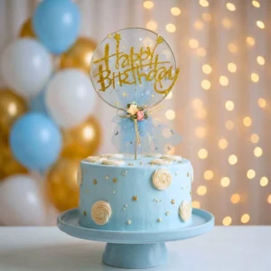 من أهم عوامل نجاح أي حفلة عيد ميلاد هو تنسيق الألوان، وده اللي بيخلي كل التفاصيل مترابطة ومبهجة للعين. وجود توبر كيك Happy Birthday باللون الذهبي مع تول أزرق بيساعدك بسهولة في تنسيق باقي عناصر الحفلة.