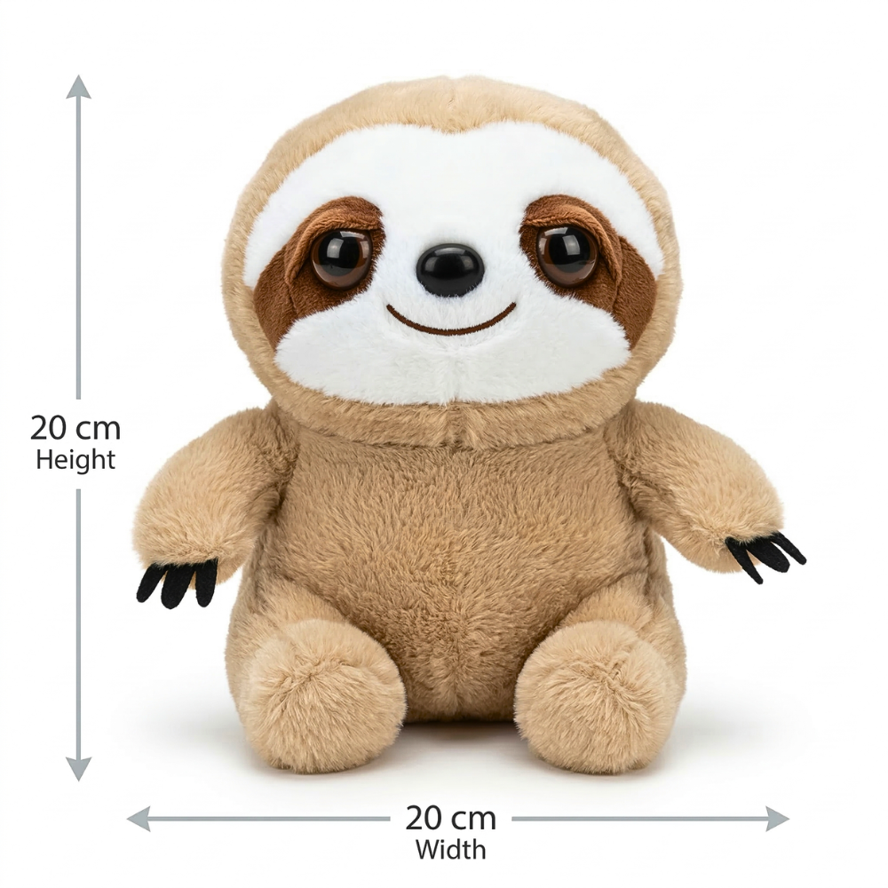 يبلغ ارتفاع دمية كسلان حوالي 20 سم بينما يصل عرضها إلى 20 سم، وهو حجم مناسب جدًا للأطفال. هذا الحجم يسمح للطفل بحمل الدمية بسهولة أثناء اللعب أو أثناء الخروج من المنزل.