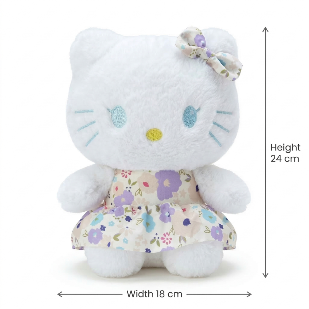 دمية هيلو كيتي بفستان مزخرف – Hello Kitty للأطفال بحجم 24 سم ارتفاع × 18 سم عرض