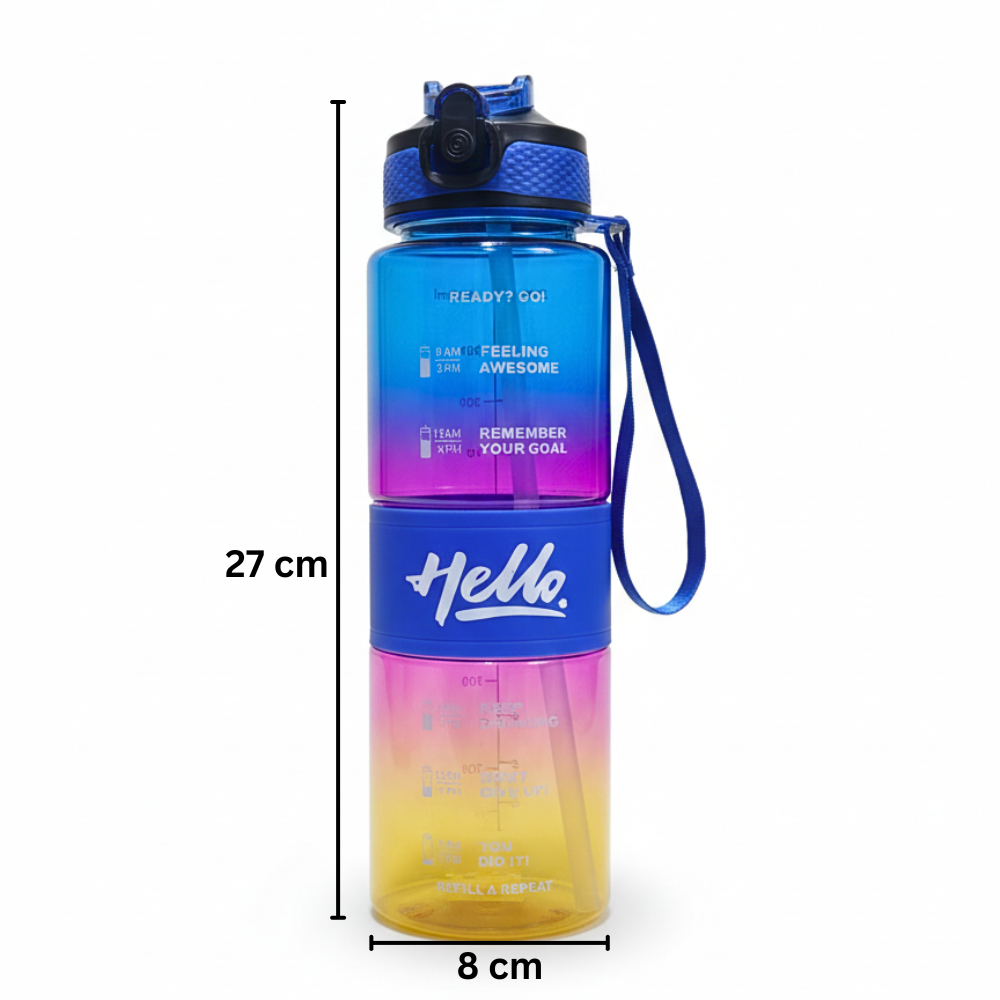 احصل على زجاجة مياه 1000 مل بسعة 1 لتر وتصميم عملي مثالي للرياضة، العمل، الدراسة والرحلات. تتميز بارتفاع 27 سم وقطر 8 سم مع غطاء محكم مانع للتسريب وتصميم ألوان متدرجة جذاب. زجاجة مياه 1000 مل مدرجة بعلامات قياس وتحفيز يومي لمساعدتك على شرب كمية المياه الكافية طوال اليوم.