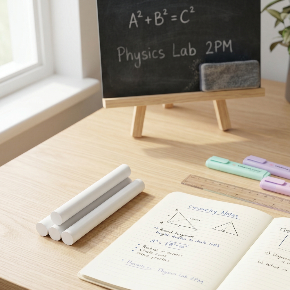 يعد طباشير أبيض من الأدوات الأساسية في الفصول الدراسية، مراكز الدروس، والمكاتب التعليمية، لأنه يوفر تجربة كتابة مريحة وواضحة، مع سهولة في المسح والتنظيف.