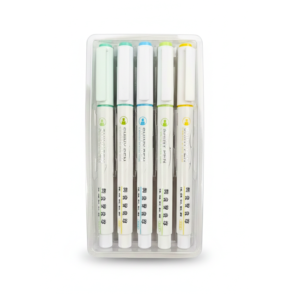 طقم أقلام تحديد بلمعة مميزة بطول 12.5 سم لكل قلم، مصمم بألوان باستيل لامعة تضيف لمسة جمالية لأي ملاحظات أو تخطيط. يحتوي الطقم على 5 ألوان جذابة: أخضر نعناع لامع، أخضر ليموني لامع، أزرق سماوي لامع، أصفر لامع، وتركواز فاتح لامع. تأتي الأقلام داخل علبة بلاستيكية شفافة مرتبة، سهلة الحمل والتخزين، ومناسبة للمذاكرة، التخطيط، التدوين، وتزيين الدفاتر والملاحظات.