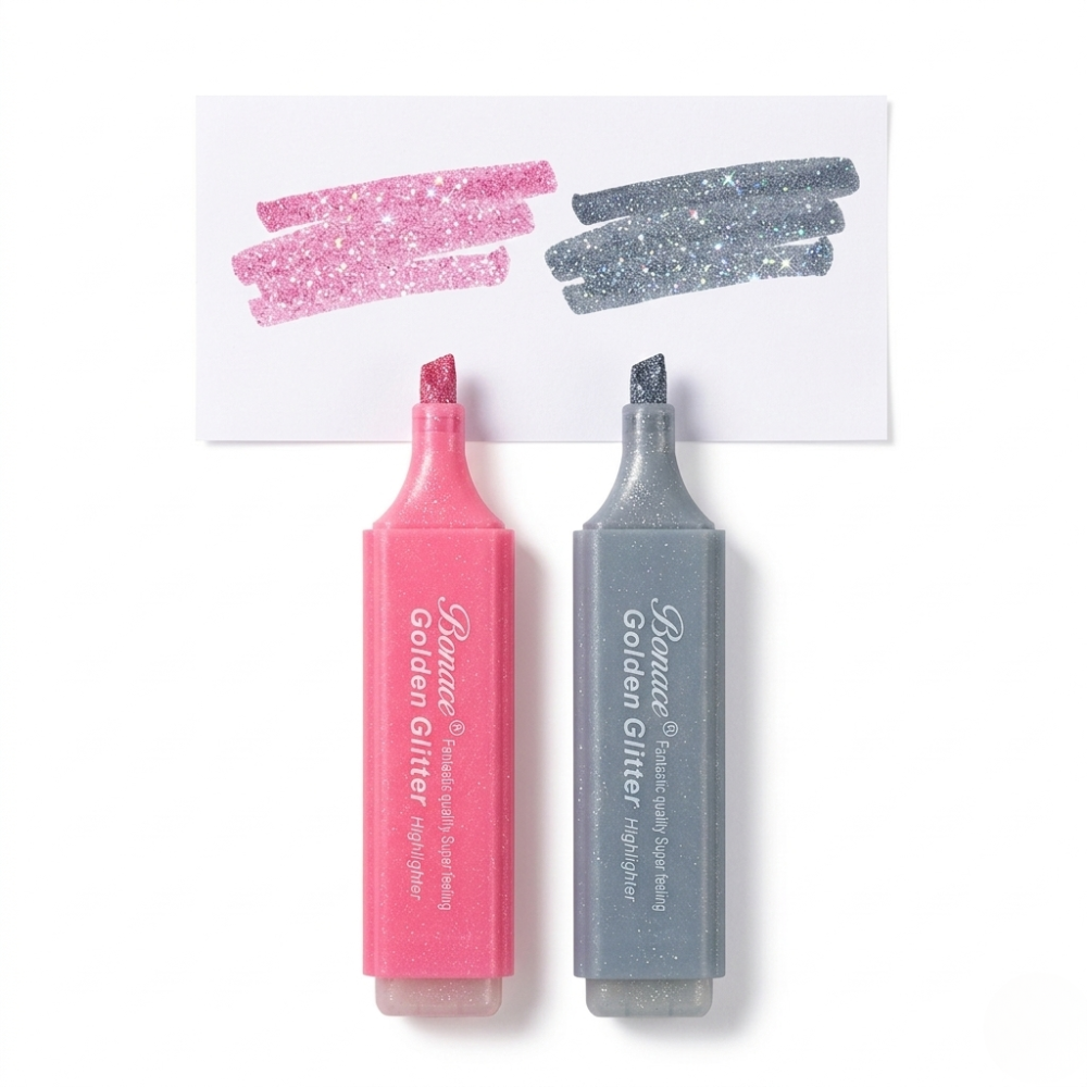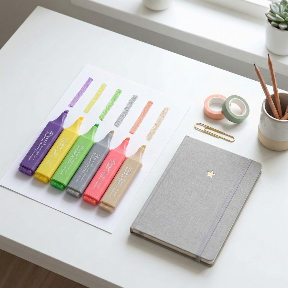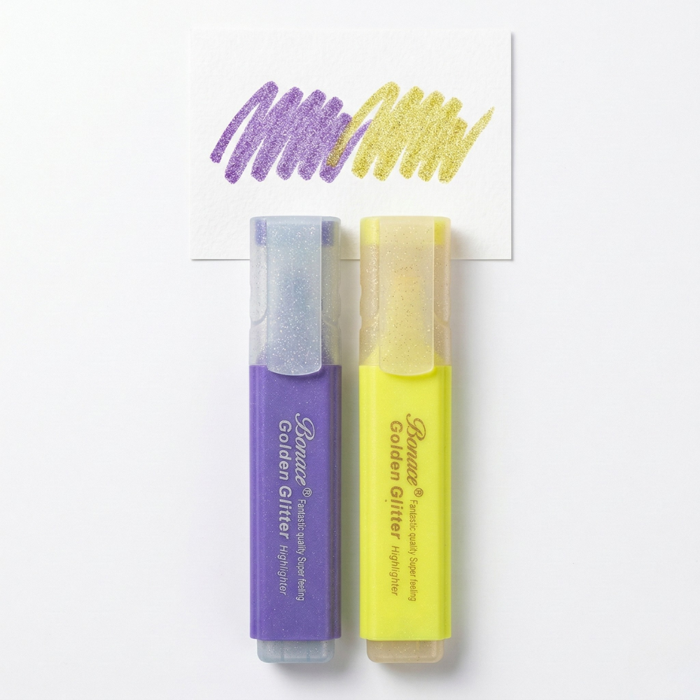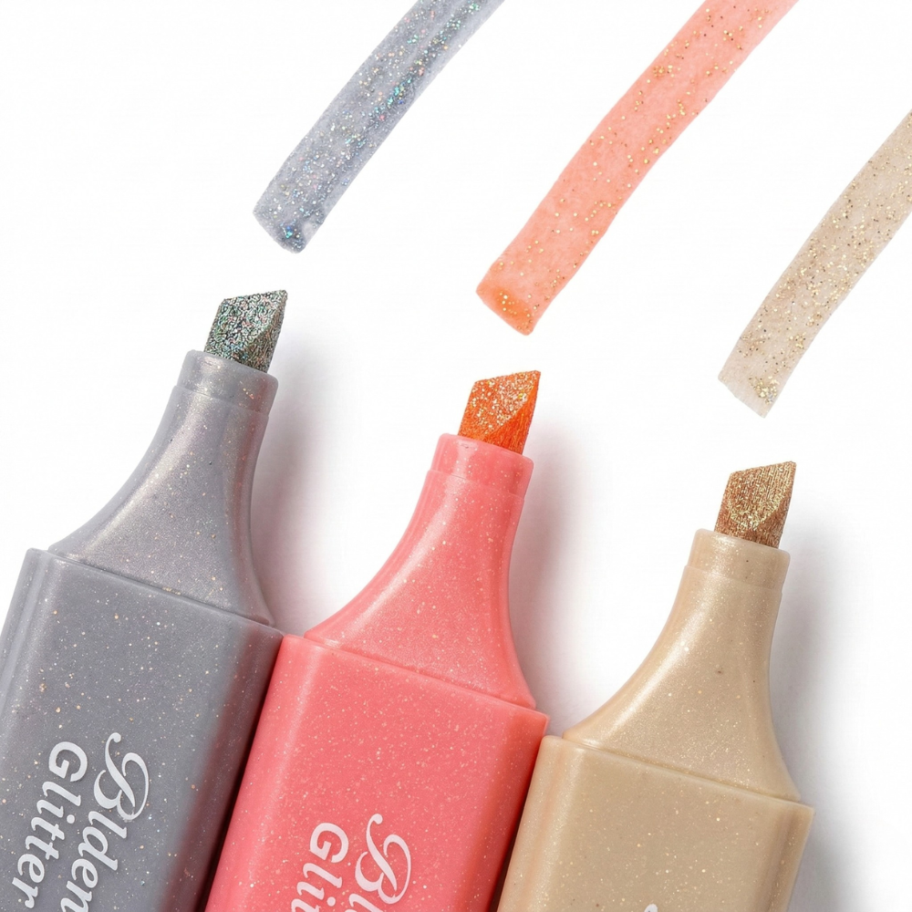 من أهم ما يميز طقم أقلام هايلايتر جليتر هو الحبر المميز الذي يحتوي على جليتر خفيف يعطي تأثيرًا لامعًا جميلًا. هذا التأثير لا يجعل النص غير واضح بل يضيف لمسة جمالية بسيطة تجعل التظليل يبدو أكثر أناقة.