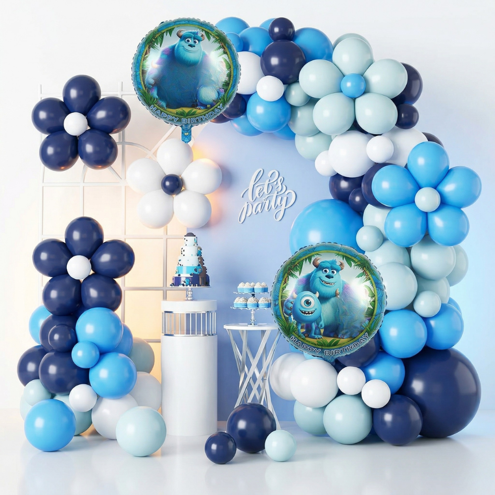 بفضل درجات اللون الأزرق والكحلي والأبيض، يُعتبر طقم بالونات شركة المرعبين المحدودة مثاليًا لحفلات الأولاد بشكل خاص. الألوان تمنح إحساسًا بالفخامة والمرح في نفس الوقت، كما أنها تتناسق بشكل رائع مع ثيمات حفلات الأطفال الحديثة.