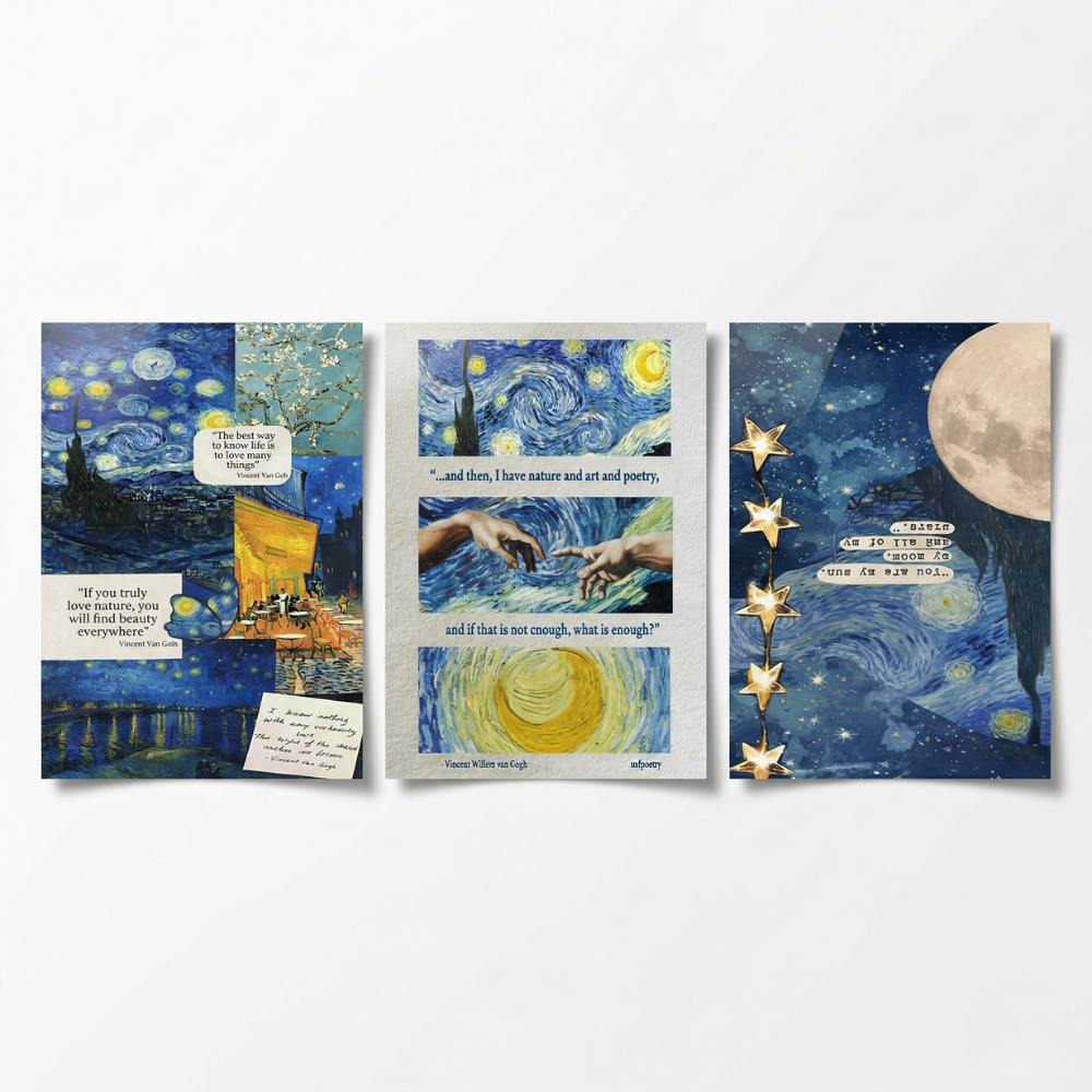 لعشاق الفن والديكور الكلاسيكي، يتوفر طقم بوسترات بتصميمات مستوحاة من أشهر اللوحات الفنية، مثل تصميمات السماء الليلية والنجوم والفن الأوروبي.