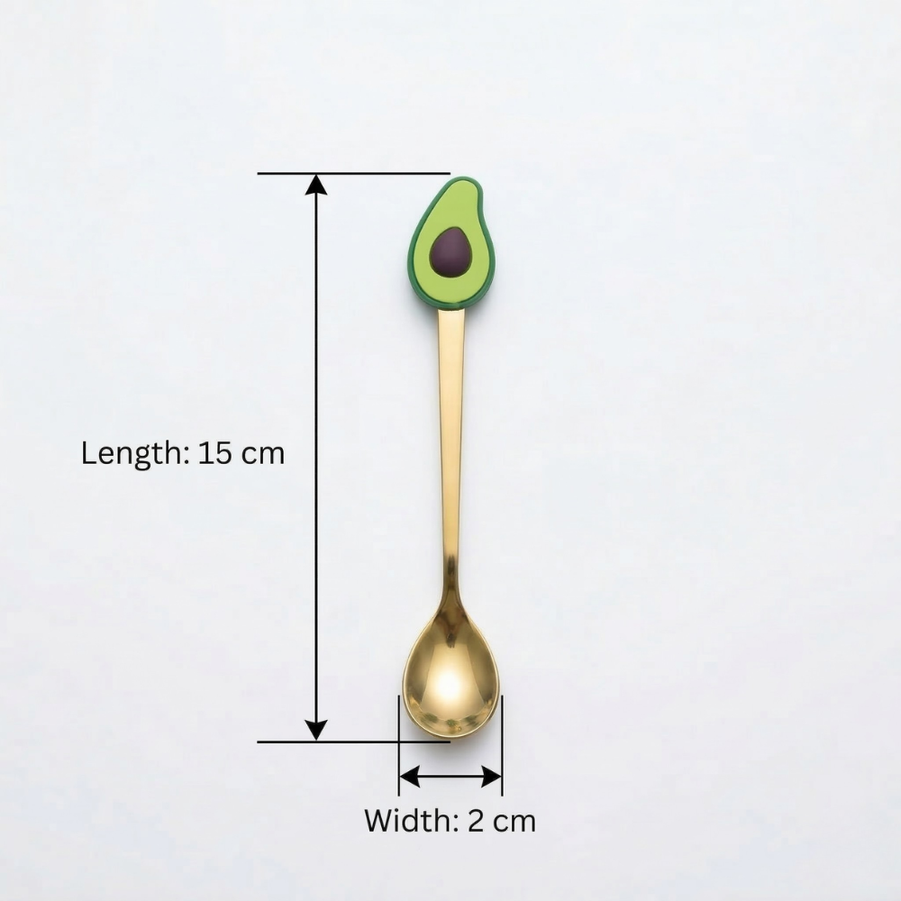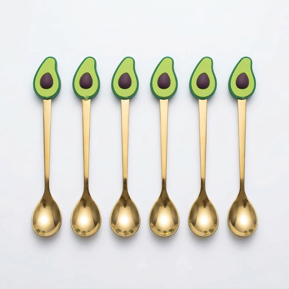 يتميز طقم ملاعق أفوكادو بتصميم لطيف مستوحى من شكل ثمرة الأفوكادو، حيث يظهر الجزء العلوي من الملعقة بشكل نصف ثمرة أفوكادو مع البذرة في المنتصف. هذا التصميم يمنح الملاعق مظهرًا مرحًا يجعلها مختلفة عن الملاعق التقليدية.