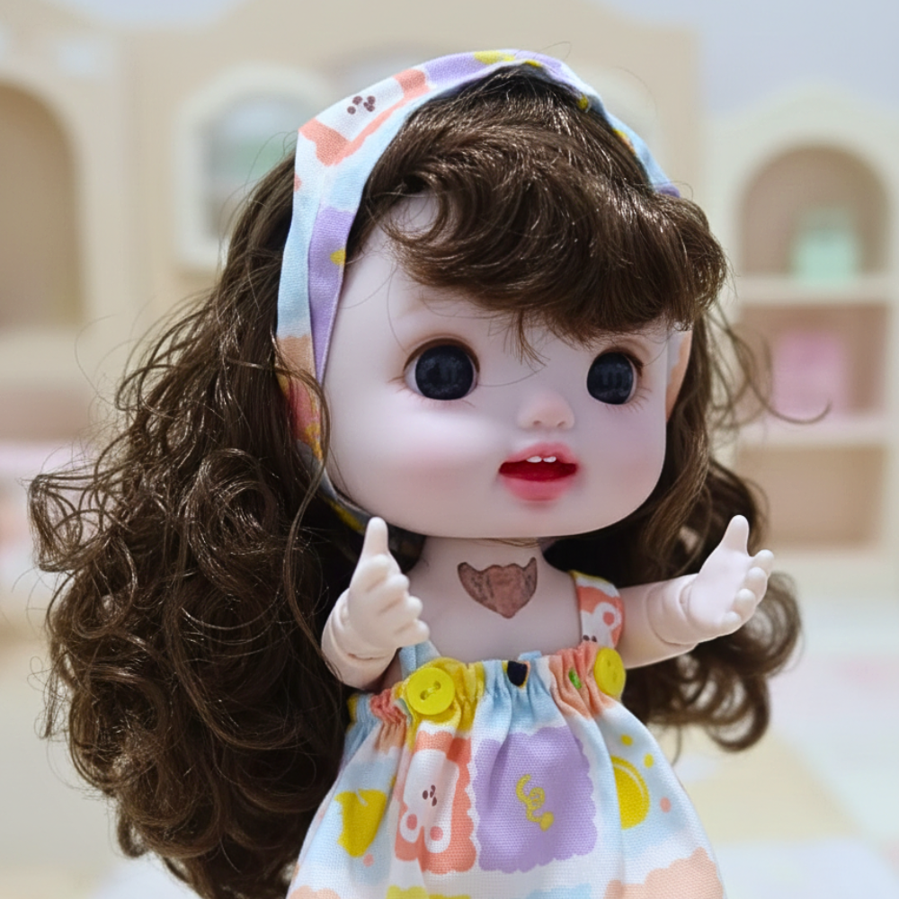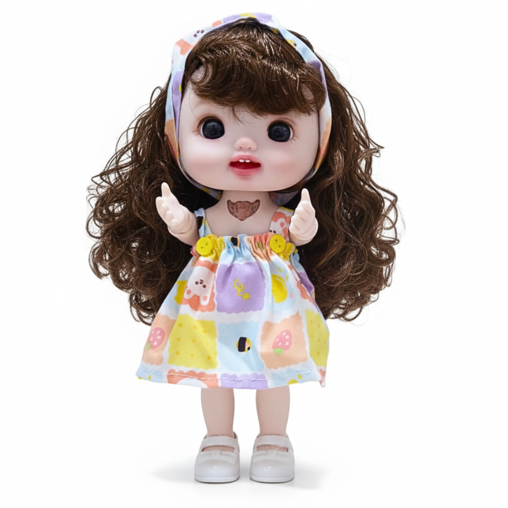 عروسة أطفال بطول 23 سم بتصميم كيوت يجذب الانتباه، تتميز بشعر بني كيرلي طويل وعيون كبيرة لامعة تمنحها مظهرًا لطيفًا ومحببًا. ترتدي هذه العروسة فستانًا ملونًا بتفاصيل جميلة مع طوق رأس أنيق، ما يجعلها مثالية للهدايا وأعياد الميلاد والمناسبات الخاصة. عروسة خفيفة وسهلة الحمل، تساعد الأطفال على تنمية الخيال والاستمتاع بساعات من اللعب الممتع.