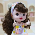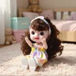 عروسة أطفال 23 سم بشعر بني كيرلي طويل وعيون كبيرة لامعة – دمية بناتي بفستان ملون وطوق رأس أنيق