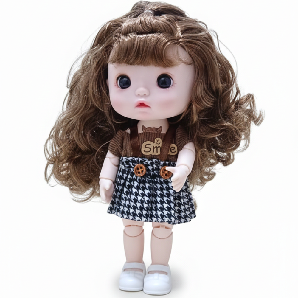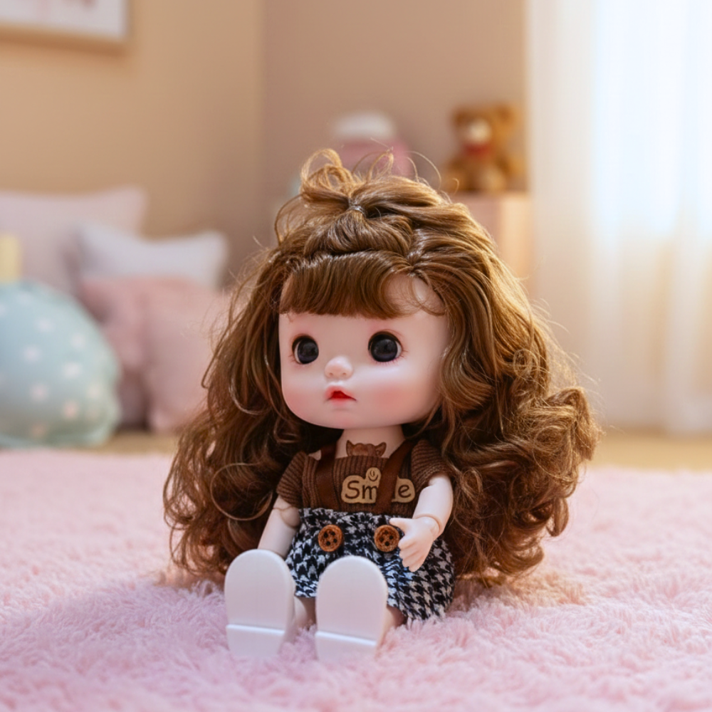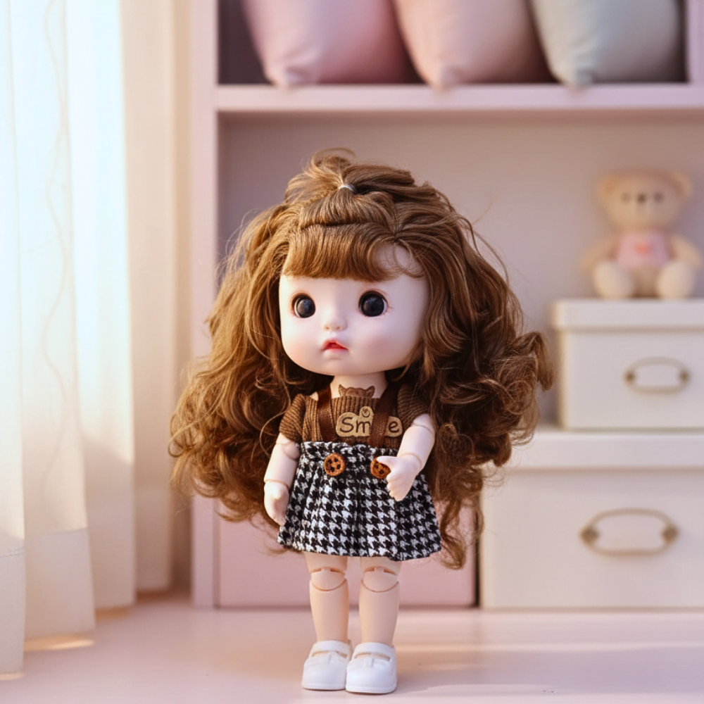 عروسة أطفال بطول 23 سم بتصميم أنيق وجذاب، تتميز بشعر بني كيرلي كثيف وعيون كبيرة لامعة تضيف لها مظهرًا لطيفًا ومميزًا. ترتدي هذه العروسة ملابس عصرية بتفاصيل جميلة تناسب الذوق الحديث، مما يجعلها اختيارًا رائعًا للهدايا وأعياد الميلاد والمناسبات المختلفة. عروسة خفيفة وسهلة الحمل، مثالية للعب اليومي وتنمية خيال الأطفال والاستمتاع بساعات من المرح.