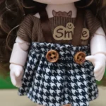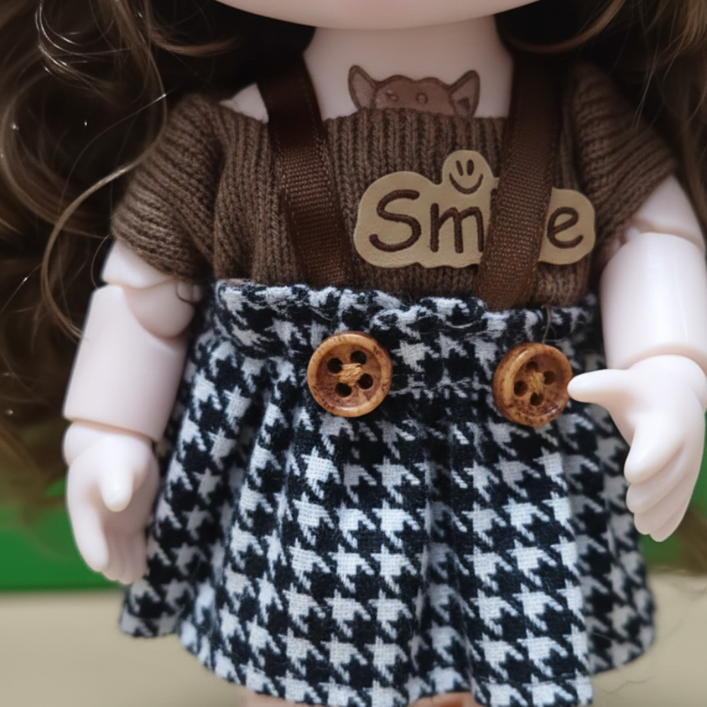 الياقة البيضاء المموجة تعطي إحساسًا بالأناقة الكلاسيكية، بينما الفيونكة الأمامية تضيف لمسة لطيفة تجعل شكل العروسة أكثر نعومة. هذه التفاصيل الصغيرة هي ما يجعل كل عروسة تبدو وكأنها شخصية مستقلة لها طابعها الخاص.