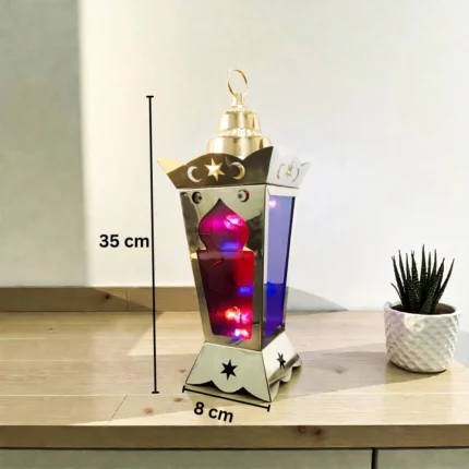 كونه مصنوعًا من خامة بلاستيكية متينة يجعله خيارًا عمليًا وآمنًا للعائلات، خصوصًا في وجود الأطفال. لا يشكل خطر الكسر أو الحواف الحادة، كما أن وزنه الخفيف يسمح بنقله بسهولة من مكان لآخر. يمكن للأطفال الاستمتاع بمظهره المضيء دون قلق، مما يجعله جزءًا من الذكريات الرمضانية الجميلة داخل البيت.