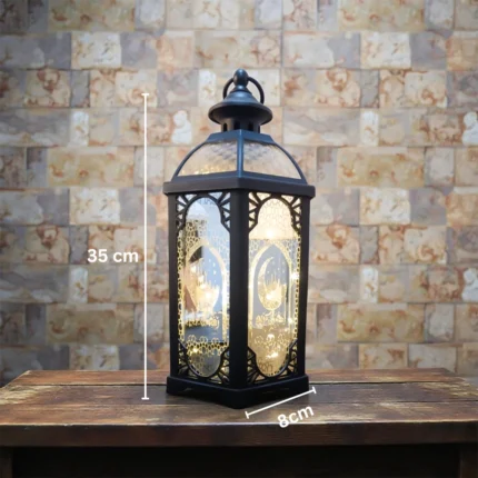 فانوس تركي ديكوري مضيء بحجم 25 × 16.5 × 10 سم، تصميم عربي أنيق بنقوش إسلامية مميزة، يصدر إضاءة دافئة تضفي أجواء رمضانية روحانية على المنزل، ومثالي للديكور أو كهدية خلال شهر رمضان الكريم.