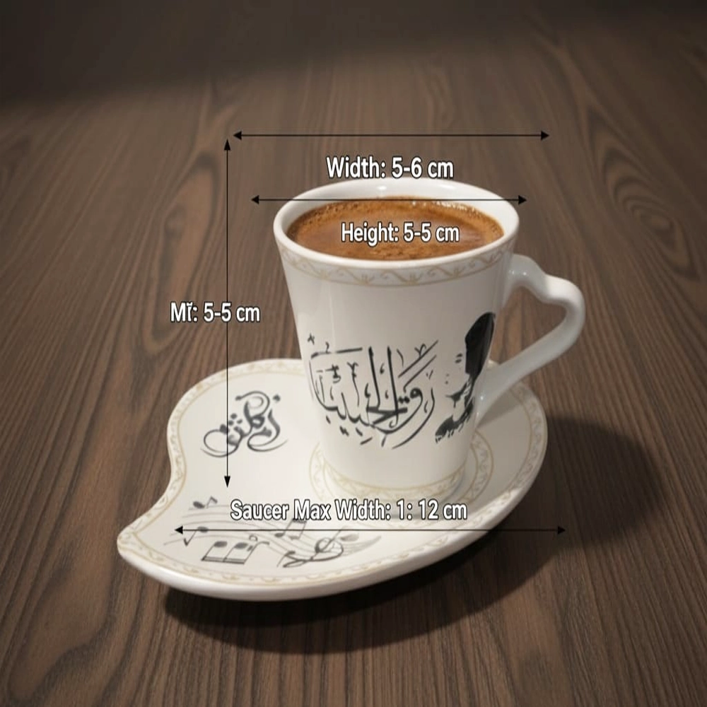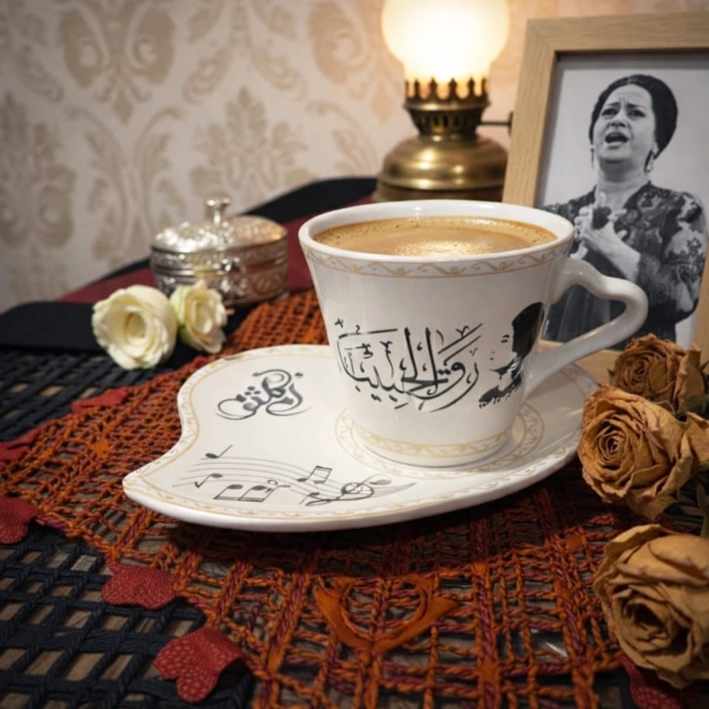 هذا الفنجان ليس مجرد أداة لتقديم القهوة، بل قطعة فنية تعبّر عن الذوق الرفيع، وتستحضر صورة أيقونة الغناء العربي التي لا تزال حاضرة في وجدان كل محب للفن الكلاسيك. اللون البيج الهادئ، والخط العربي الأنيق، والصحن المتناسق، كلها عناصر تجتمع لتقديم منتج متكامل يلائم الاستخدام اليومي ويليق بالتقديم في المناسبات الخاصة.