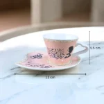 فنجان أم كلثوم لون بينك مصنوع من البورسلين عالي الجودة بسعة 90 مل مع صحن أنيق، يتميز بتصميم عربي كلاسيك مستوحى من كوكب الشرق، مثالي لتقديم القهوة العربي والتركي ولمحبي الذوق الفني الأصيل والهدايا الراقية.
