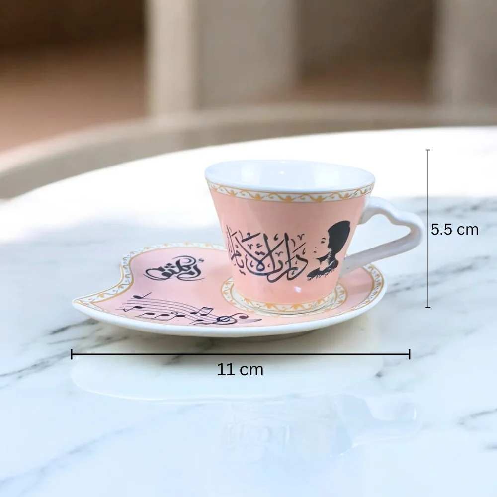 هذا الفنجان ليس مجرد أداة لتقديم القهوة، بل قطعة فنية تعبّر عن الذوق الرفيع، وتستحضر صورة أيقونة الغناء العربي التي لا تزال حاضرة في وجدان كل محب للفن الكلاسيك. اللون البيج الهادئ، والخط العربي الأنيق، والصحن المتناسق، كلها عناصر تجتمع لتقديم منتج متكامل يلائم الاستخدام اليومي ويليق بالتقديم في المناسبات الخاصة.