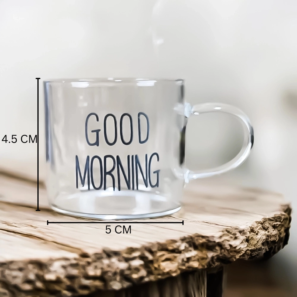 فنجان زجاج شفاف بتصميم Good Morning – حجم صغير أنيق للمشروبات الساخنة