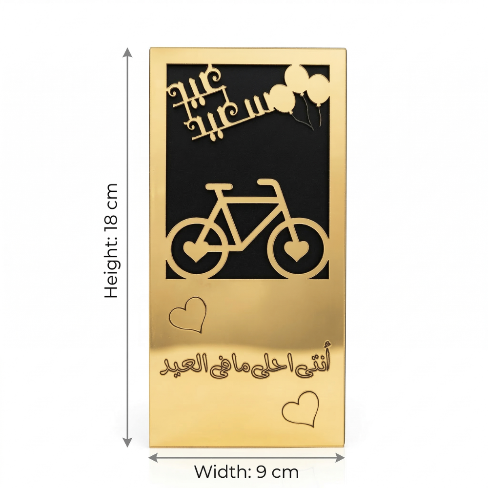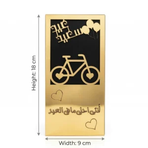 كارت عيدية خشب بتصميم عيد سعيد مع دراجة وقلوب – بطاقة عيدية للهدايا مقاس 18×9 سم