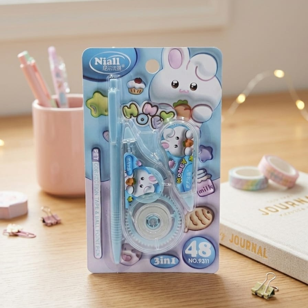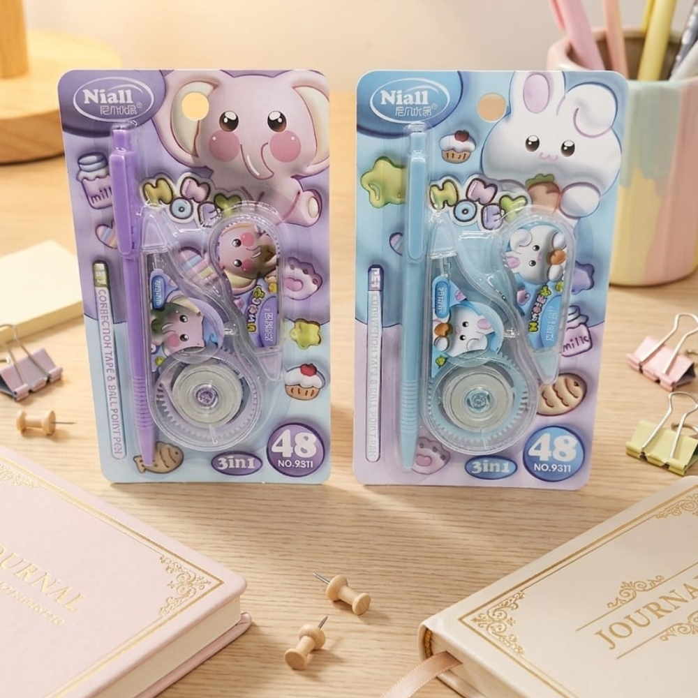 احصلي على كوريكتور 2 شريط 6 متر مع قلم بتصميم لطيف ومميز مناسب للأطفال والطلاب، يجمع بين شريطين كوريكتور بطول 6 متر لكل شريط وقلم كتابة عملي في عبوة واحدة 3 في 1. مثالي للمدرسة، الجامعة، المكتب، والمذاكرة اليومية، مع تصميمات كيوت جذابة مثل الأرنب والفيل.