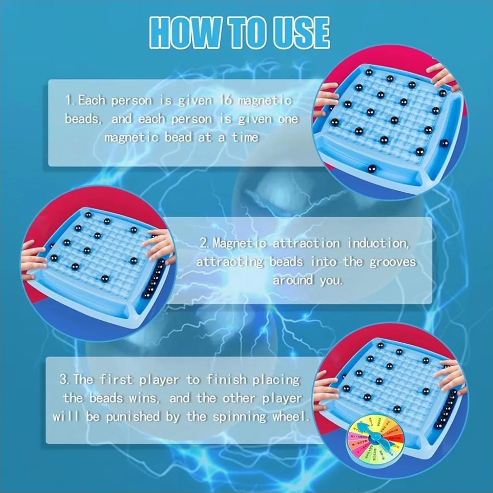 تلعب لعبة الشطرنج المغناطيسية بأسلوب بسيط لكنه يعتمد على الذكاء والدقة. يبدأ اللاعبون بوضع اللوحة على الطاولة، ثم توزيع الكرات المعدنية المغناطيسية بالتساوي. في كل دور، يضع اللاعب كرة واحدة على الشبكة المخددة. إذا جذبت الكرة كرات أخرى بسبب المغناطيس، يجب على اللاعب رفع كل الكرات التي انجذبت. الهدف هو التخلص من كامل الكرات التي يمتلكها اللاعب، ومن ينجح أولًا يصبح الفائز.