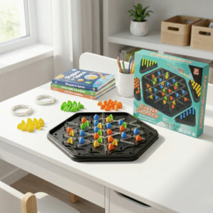 لعبة ذكاء هندسية تعليمية ممتعة للأطفال والكبار، تساعد على تنمية التفكير المنطقي، التخطيط، والتركيز من خلال تركيب الأشكال وربط القطع المطاطية بطرق متعددة. مناسبة لعمر +3 سنوات، وتدعم اللعب الجماعي حتى 4 لاعبين، مما يجعلها اختيارًا مثاليًا للتعلم والمرح في نفس الوقت.