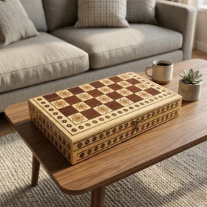تتميز لعبة طاولة خشبية الموجودة بالصورة بتصميم راقٍ يعتمد على تدرجات ألوان الخشب الطبيعية، مع نقوش هندسية مميزة في المنتصف تضيف لمسة من الفخامة.