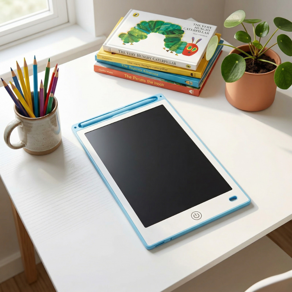 استخدام لوح كتابة LCD يجعل التعلم أكثر متعة، حيث يمكن للطفل الكتابة والمسح وإعادة المحاولة مرات كثيرة بدون ملل.