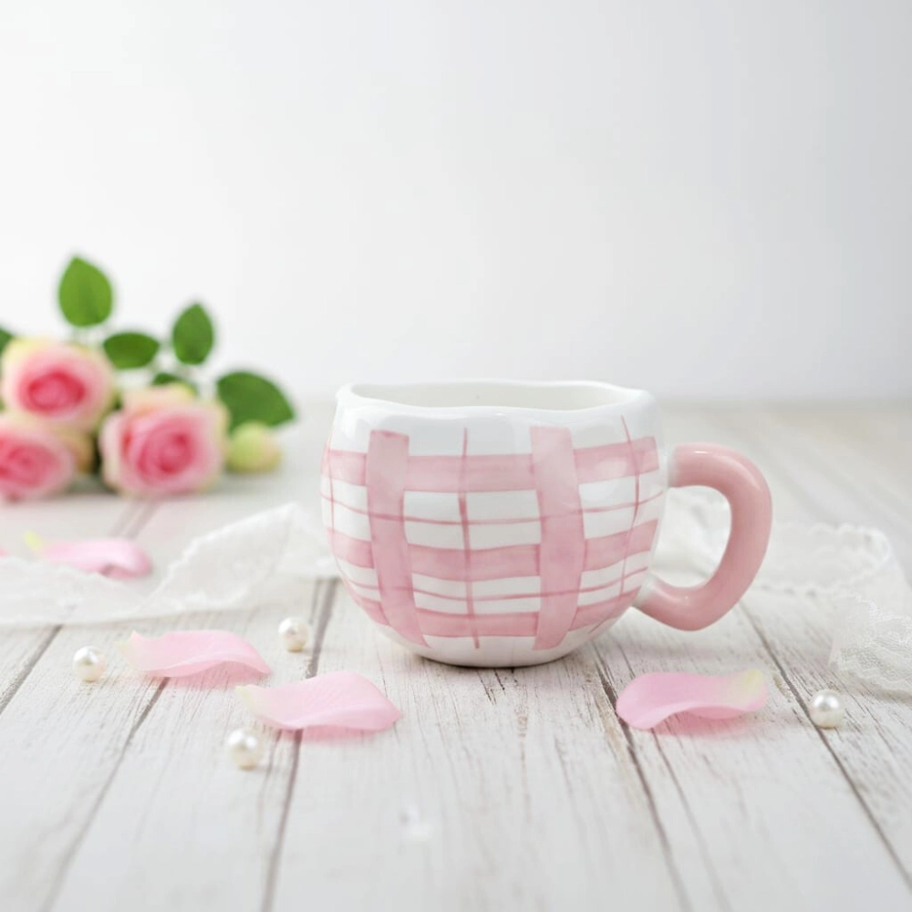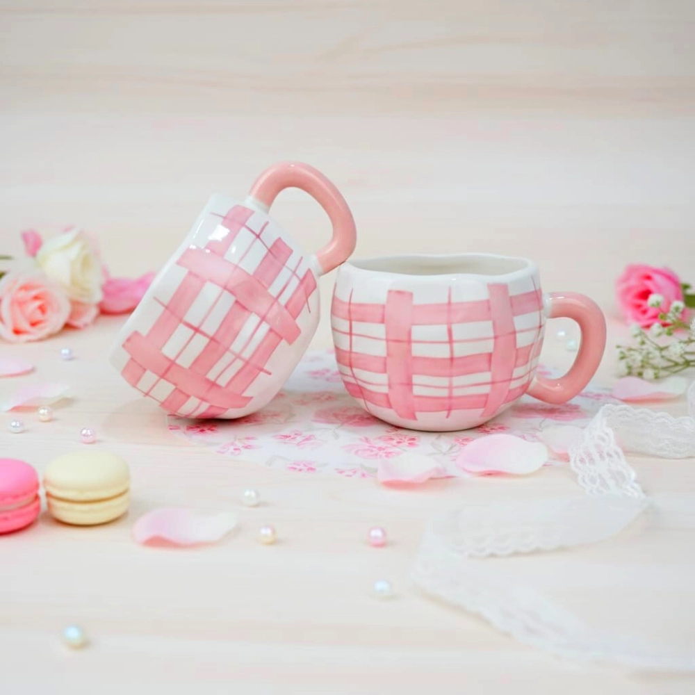 يأتي مج البورسلين الكاروهات بنقشة كاروهات وردية ناعمة مستوحاة من النمط الكلاسيكي الذي يجمع بين العصرية والدفء. الكاروهات من الأنماط الشهيرة في الموضة والديكور، وهي ترتبط دائمًا بالإحساس بالراحة والبساطة المنظمة.