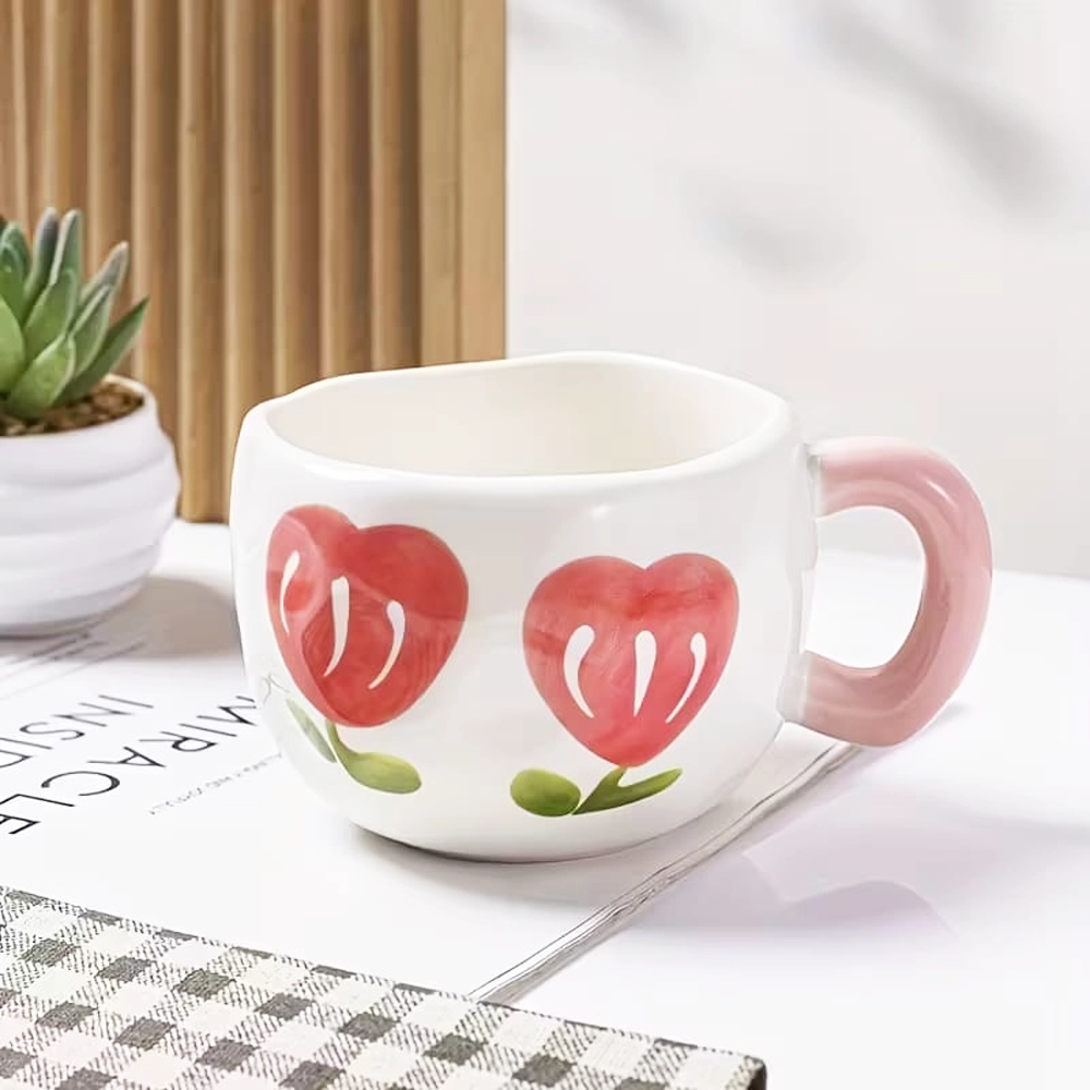 من أهم ما يميز مج القلوب الوردية هو مقبضه المصمم بطريقة هندسية مريحة تسمح بالإمساك به بثبات دون أي ضغط على اليد. المقبض عريض بما يكفي لتوفير الراحة، ولا يتأثر بحرارة المشروب. توازن الشكل بين حجم المج والمقبض يجعل تجربة الاستخدام مميزة وسهلة.
