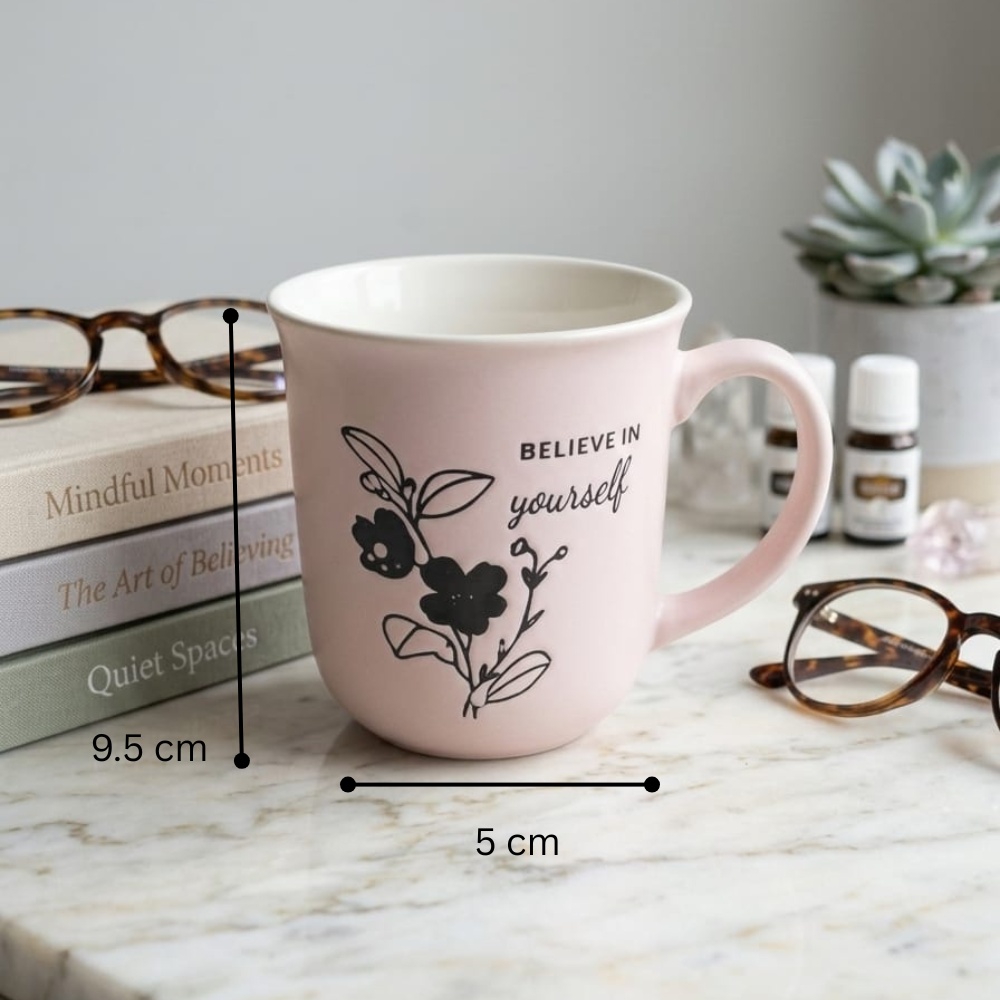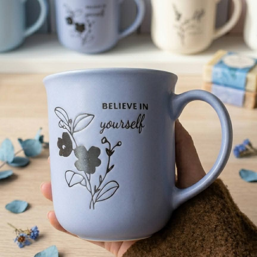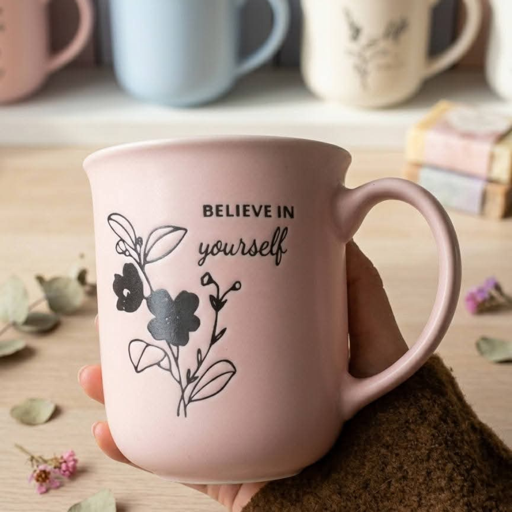 التصميم الموجود على الكوب يعكس هذا الاتجاه بوضوح، حيث يعتمد على رسومات ناعمة وكلمات بسيطة تضيف لمسة من الإيجابية والجمال.