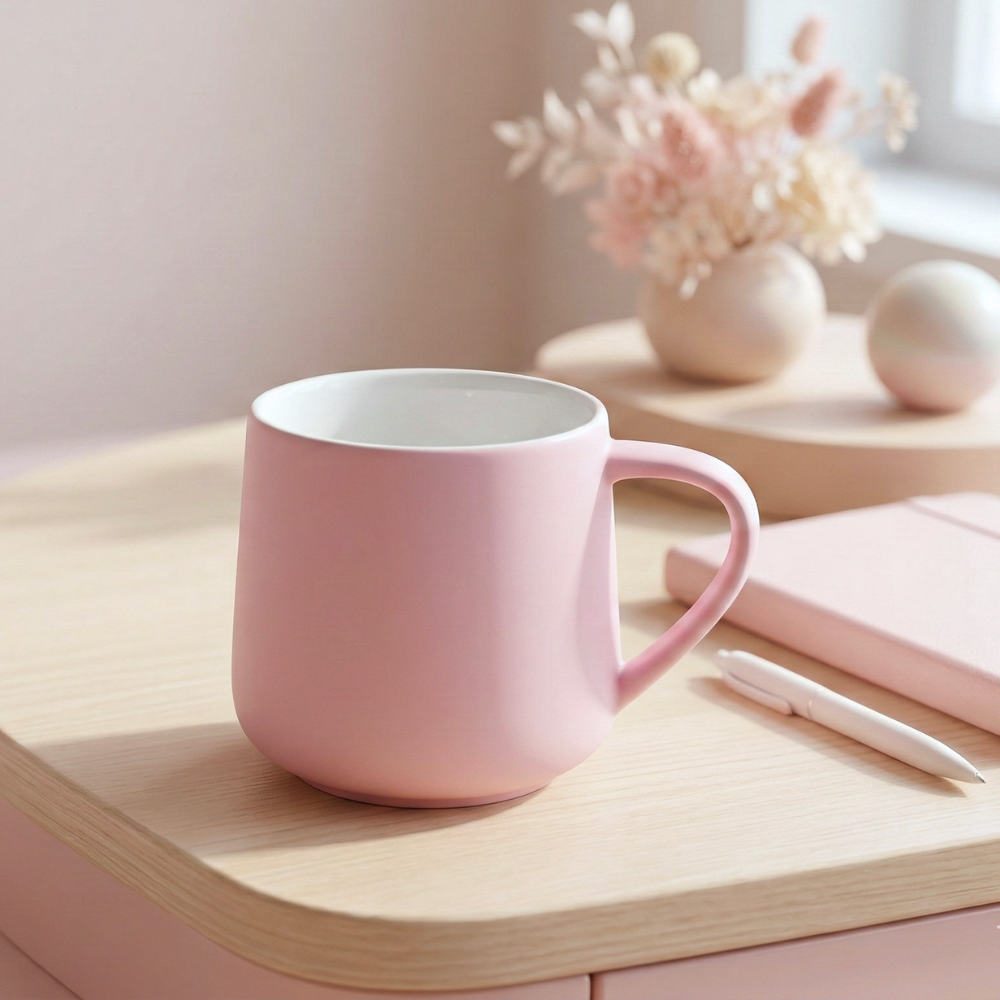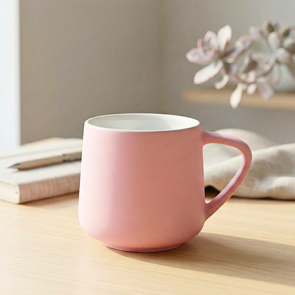 اللون البينك المطفى يمنحه طابعًا راقيًا بعيدًا عن اللمعان المبالغ فيه، مما يجعله مناسبًا للمكاتب، غرف المعيشة، أو حتى جلسات التصوير الخاصة بمنتجات القهوة.
