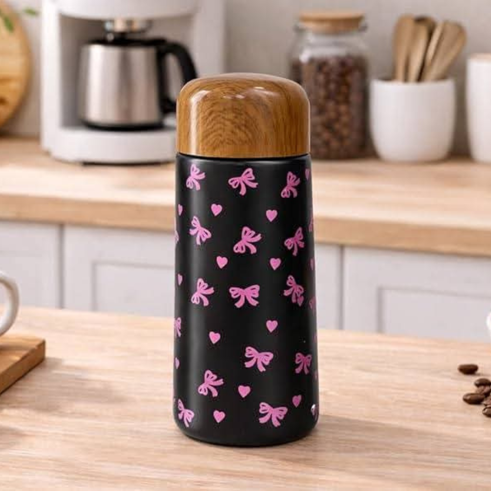 كما يحتوي المج على نقوش صغيرة على شكل قلوب وربطات صغيرة تضيف لمسة أنثوية لطيفة للتصميم. هذه التفاصيل الصغيرة تجعل مج حراري ليس مجرد كوب للمشروبات، بل قطعة جمالية يمكن أن تضيف لمسة ديكور أنيقة على المكتب أو في المطبخ.