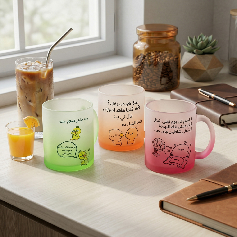 مج زجاج وردي بتصميم فروستد أنيق وتدرج لوني جذاب، سعة 300 مل، مناسب للمشروبات الساخنة والباردة مثل القهوة، الشاي، الآيس كوفي والعصائر. يتميز برسومات كيوت وعبارات متنوعة تضيف لمسة مرحة وعصرية، ليكون اختيارًا مثاليًا للاستخدام اليومي أو كهدية مميزة.
