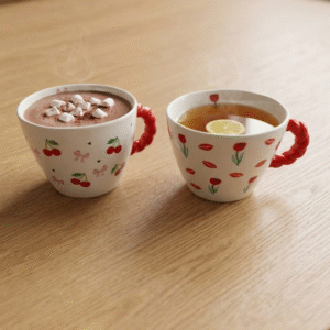 مج سيراميك 400 مل بمقبض أحمر وتصميمات كرز وتوليب – كوب قهوة أنيق وعصري