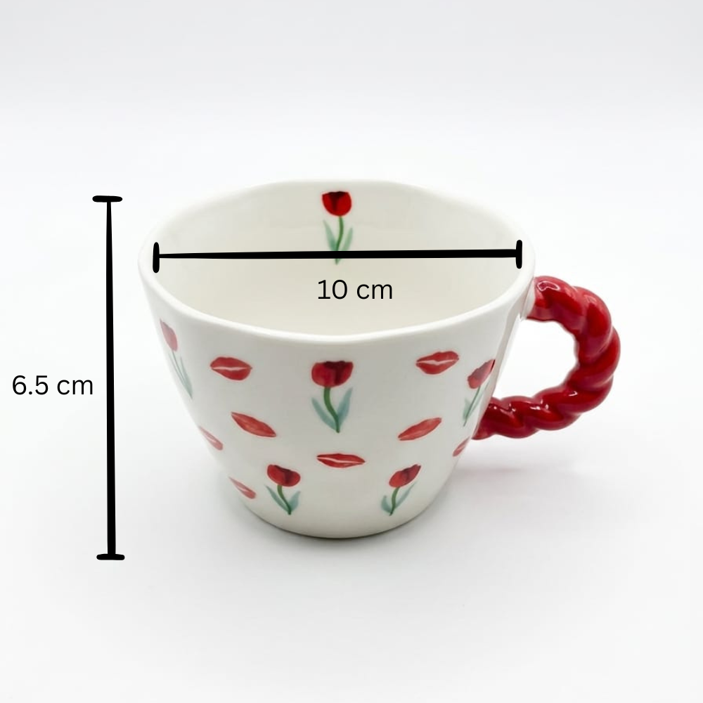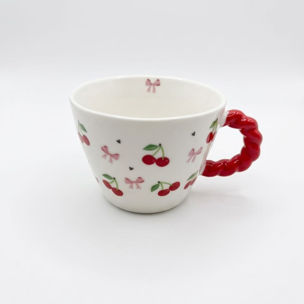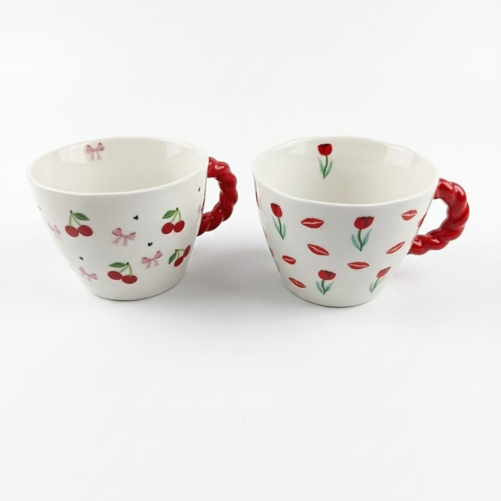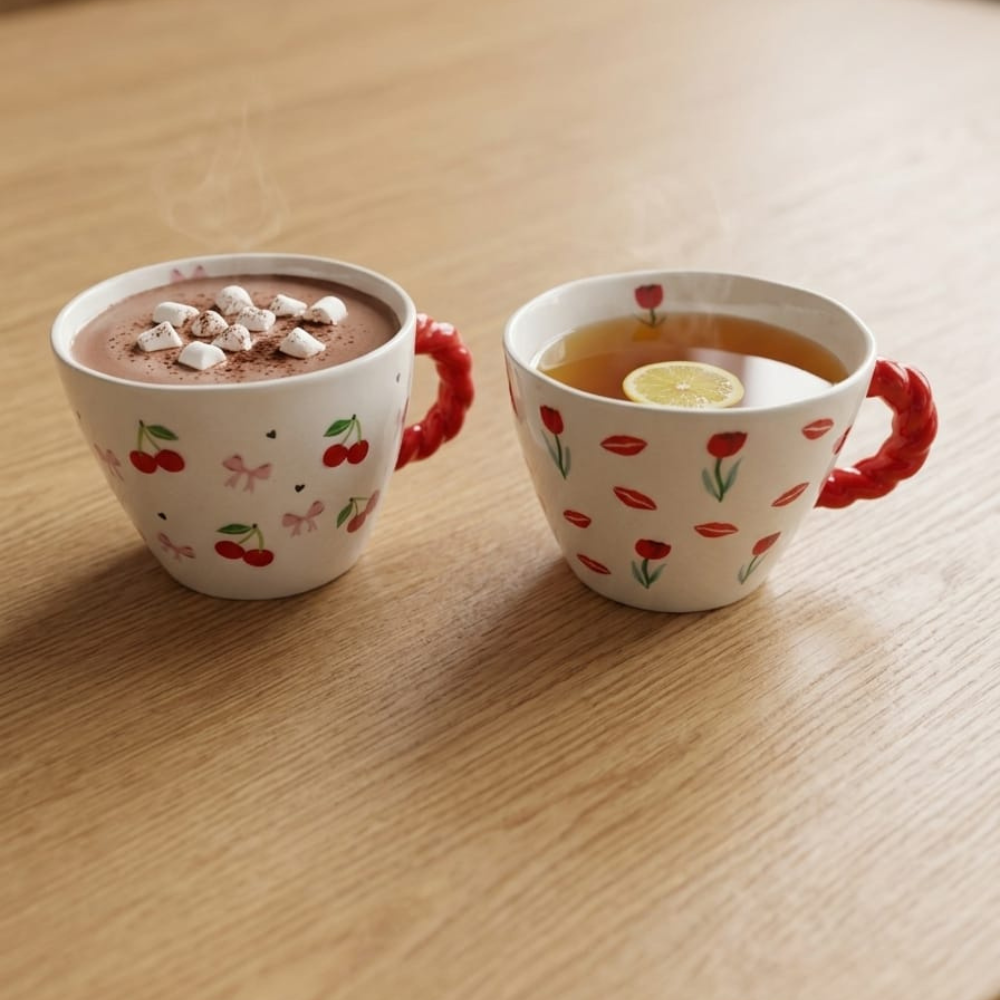 مج سيراميك 400 مل بمقبض أحمر وتصميمات كرز وتوليب – كوب قهوة أنيق وعصري