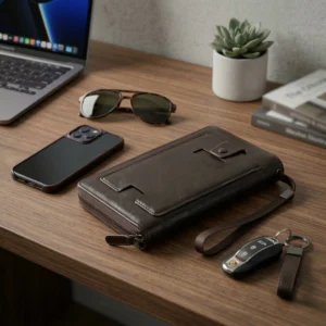 محفظة جلد بني داكن رجالي Zuolidaishu بسحاب وسوار يد – مقاس 22×12 سم