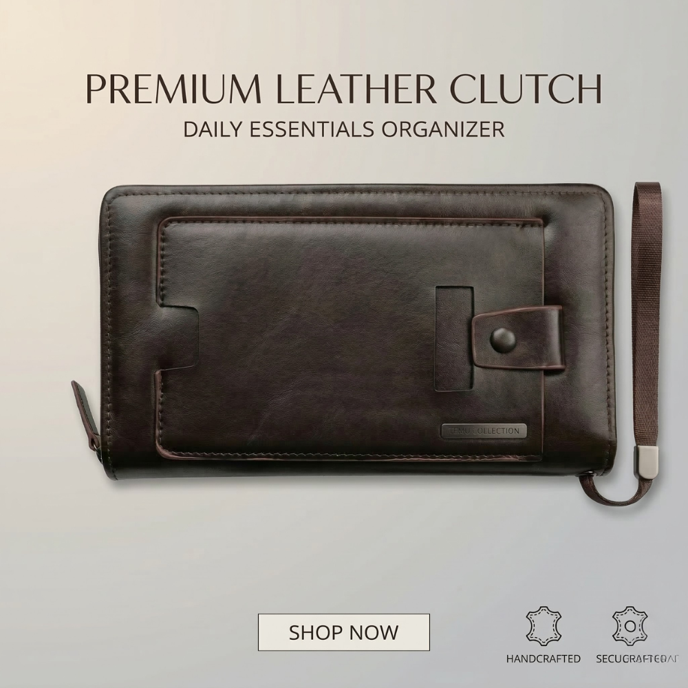 تأتي محفظة جلد بني داكن مع سوار يد مريح وسحاب قوي يضمن الحفاظ على محتوياتك بأمان، كما توفر العديد من الجيوب المخصصة لحفظ النقود والبطاقات والعملات المعدنية بطريقة منظمة وسهلة الوصول. يبلغ مقاس المحفظة حوالي 22 سم عرض × 12 سم طول، وهو حجم مثالي يسمح بحملها بسهولة مع توفير مساحة تخزين واسعة.