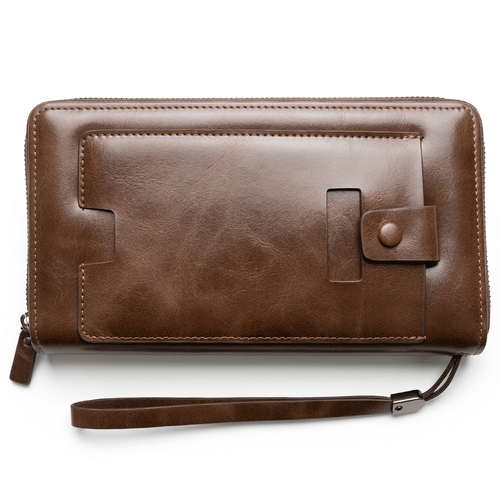 الجلد المستخدم يعطي إحساس بالقيمة ويجعل محفظة يد جلد بني استثمار طويل الأمد.