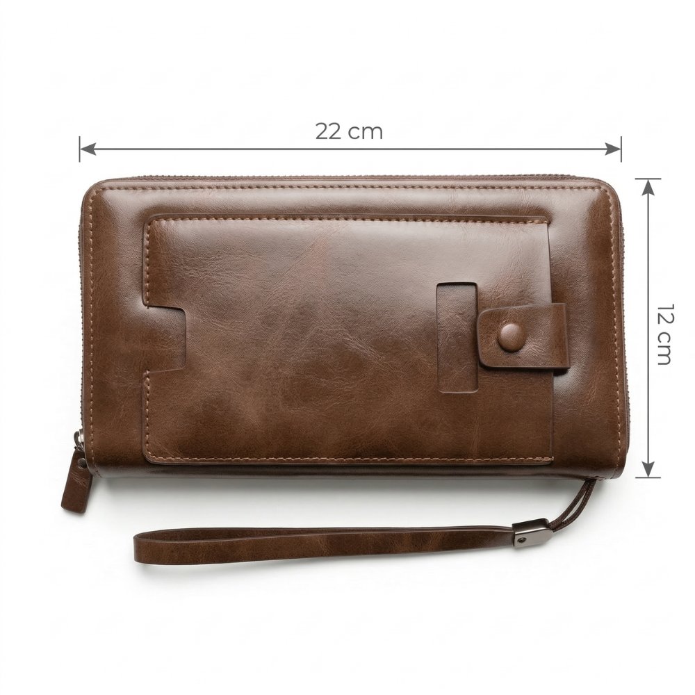 تأتي محفظة يد جلد بني بسحاب عالي الجودة يضمن: